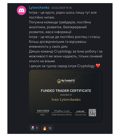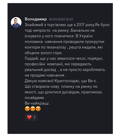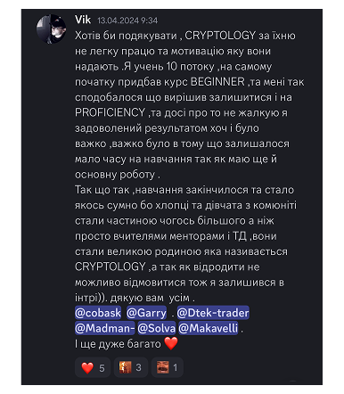 Дуже задоволений навчанням у CRYPTOLOGY ACADEMY, радий, що обрав саме вас, адже ті знання, які я отримав, повністю перевернули моє мислення в цій сфері. Окрема подяка наставнику, який доступно розжовував кожну тему. Я дійсно впевнений, що знаю, що мені да